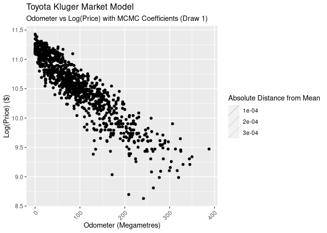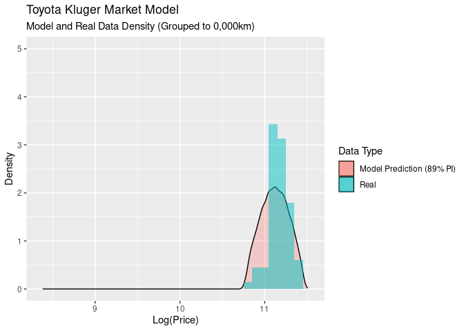 Despite these obvious flaws, let’s see how the model performs answering our original question: “what is the market sell price for a Toyota Kluger with 60,000kms on the odometer?” I’m using this line from the generated values section of the Stan model: